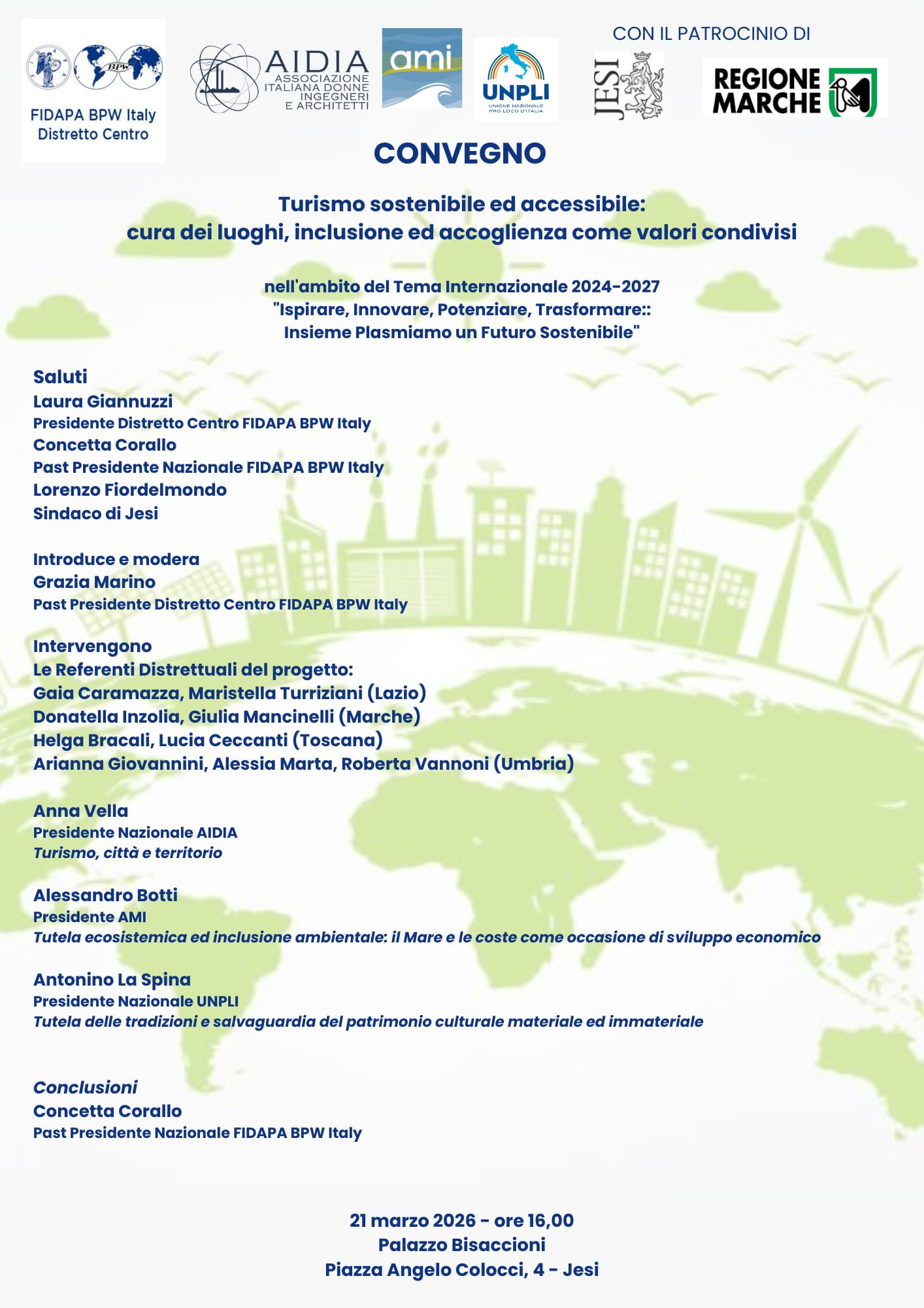 Sabato 21 marzo si svolge a Jesi il convegno "Turismo sostenibile ed accessibile: cura dei luoghi, inclusione ed accoglienza come valori condivisi" nell'ambito del Tema Internazionale 2024-2027 "Ispirare, Innovare, Potenziare, Trasformare: insieme plasmiamo un Futuro Sistenibile" coordinato dalla Past Presidente Distretto Centro Grazia Marino.