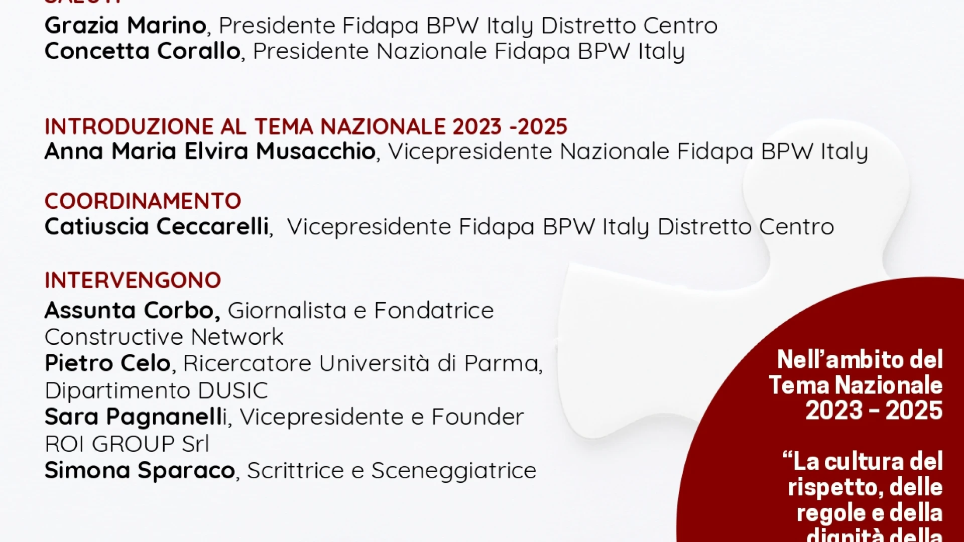 L'obiettivo è realizzare un documento ufficiale, firmato dal Distretto Centro, che possa essere adottato dalle istituzioni territoriali come riferimento per promuovere l'indipendenza e il ruolo attivo delle donne nella società e nell’economia. Un lavoro corale, un gioco di squadra che rispetta la progettualità condivisa voluta sin dall’inizio del Biennio 2023-2025 dalla Presidente Distrettuale Grazia Marino.