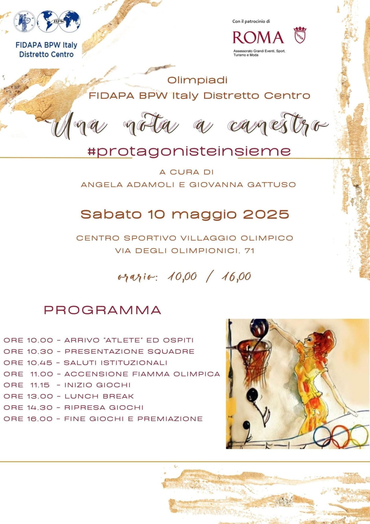 L’evento “Una nota a canestro”, promosso da FIDAPA BPW Italy – Distretto Centro, si terrà sabato 10 maggio 2025 presso il Centro Sportivo Villaggio Olimpico di Roma e rappresenta le Olimpiadi del Distretto Centro 2025, all’insegna del motto #protagonisteinsieme.